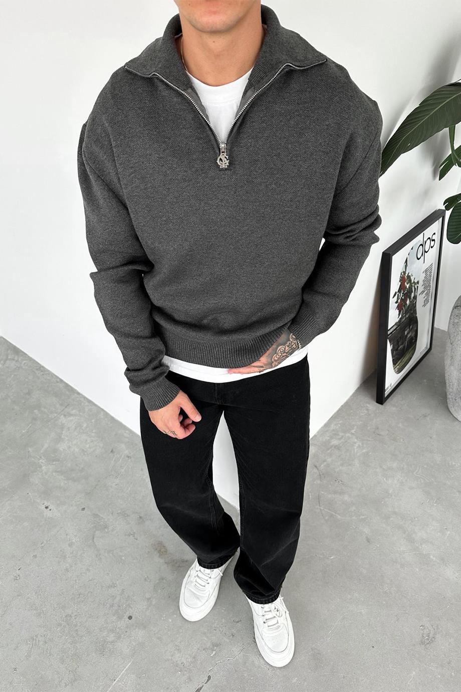 Antrasit Yarım Fermuarlı Boğazlı Triko Kazak (HF0076-GO-K)