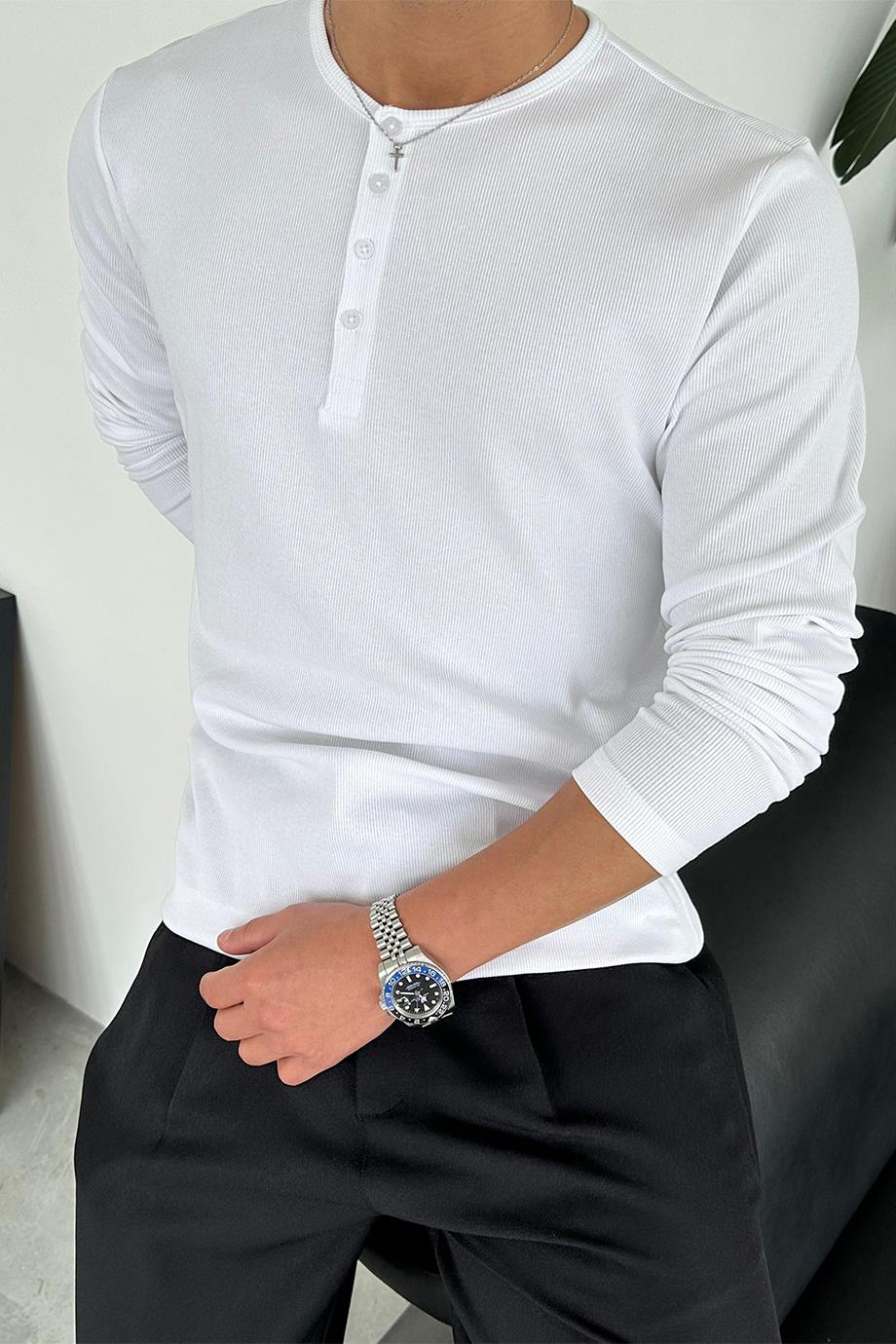 Beyaz Fitilli Düğmeli Yaka Relaxed Uzun Kollu Tişört (HF0031-PM-K)