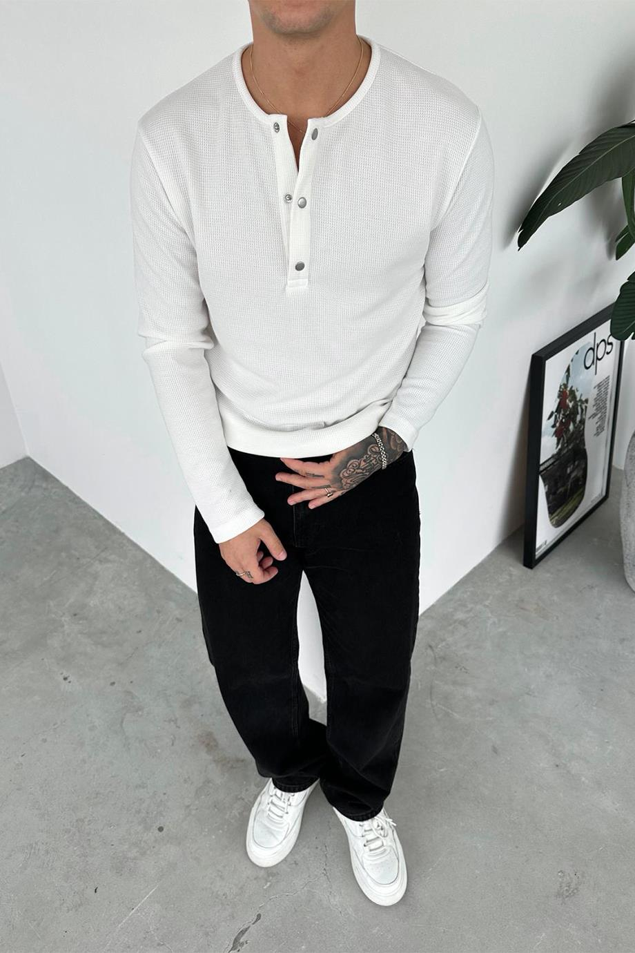 Beyaz Premium Örme Waffle Düğmeli Yaka Uzun Kollu Tişört