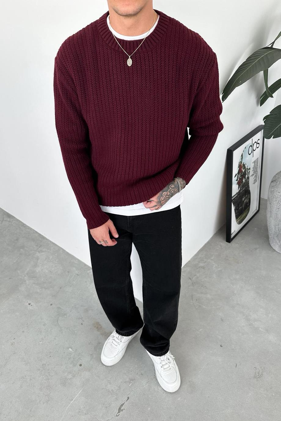 Bordo Örme Desen Relaxed Triko Kazak (HF0045-MH-K)