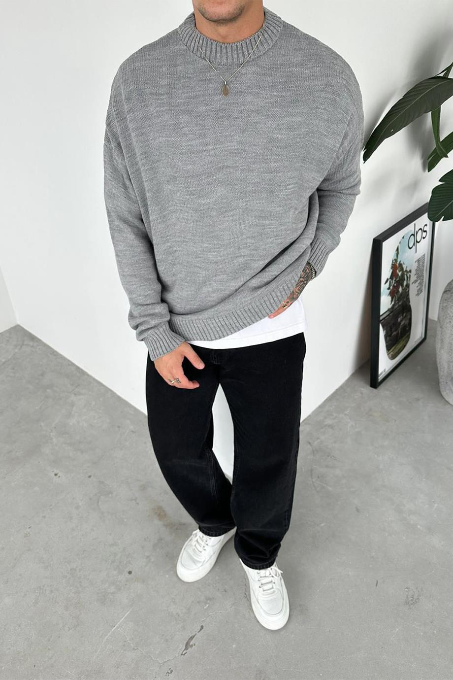 Gri Basic Bisiklet Yaka Triko Kazak (HF0014-PM-K)