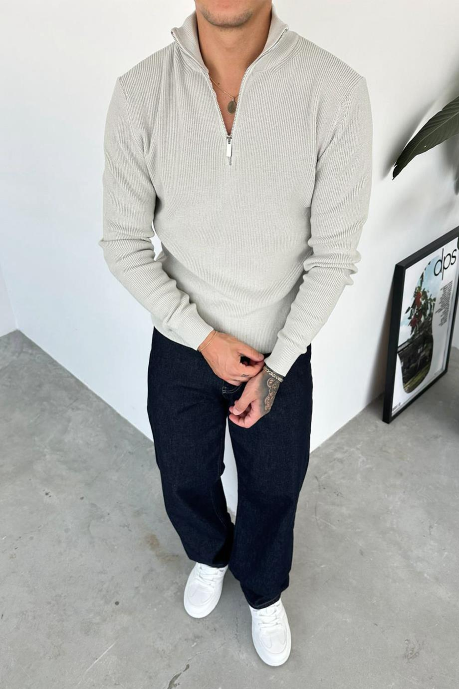 Gri Basic Fitilli Yarım Fermuarlı Relaxed Kazak