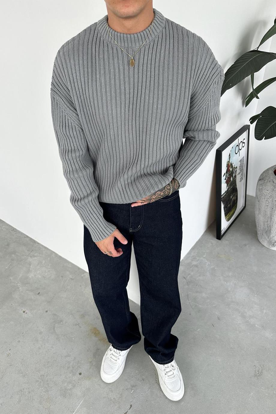 Gri Bisiklet Yaka Fitilli Oversize Triko Kazak (HF0043-MH-K)