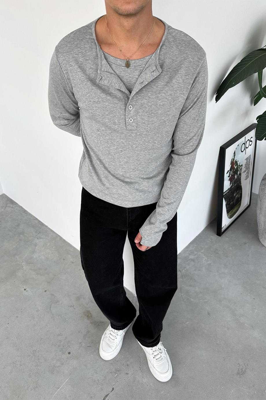 Gri Düğmeli Yaka Relaxed Uzun Kollu Tişört (HF0059-GO-K)