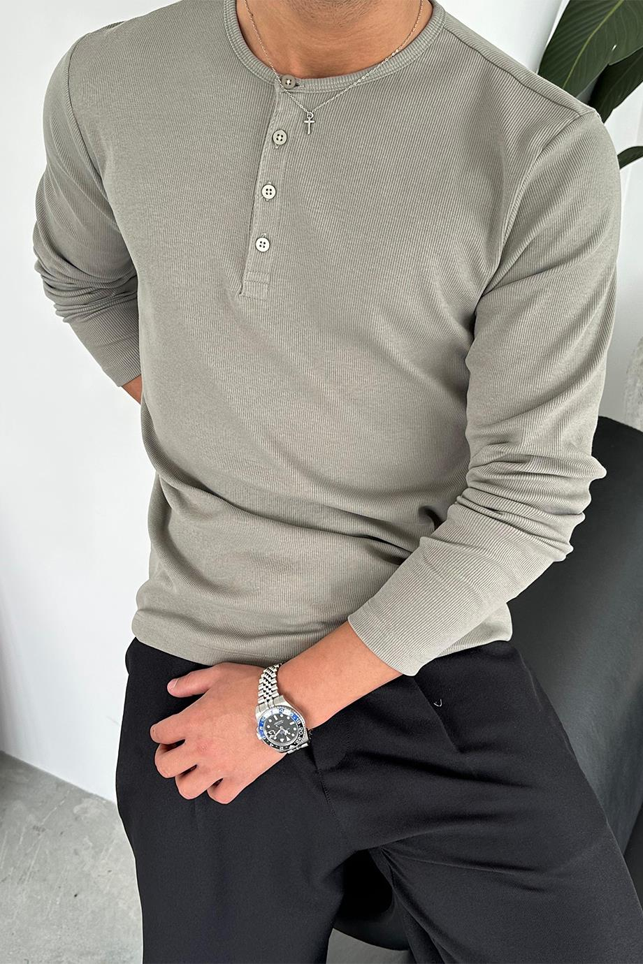 Gri Fitilli Düğmeli Yaka Relaxed Uzun Kollu Tişört (HF0031-PM-K)
