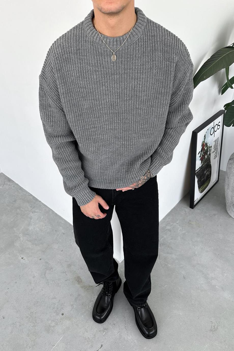 Gri Örme Desen Oversize Triko Kazak (HF0088-GO-K)