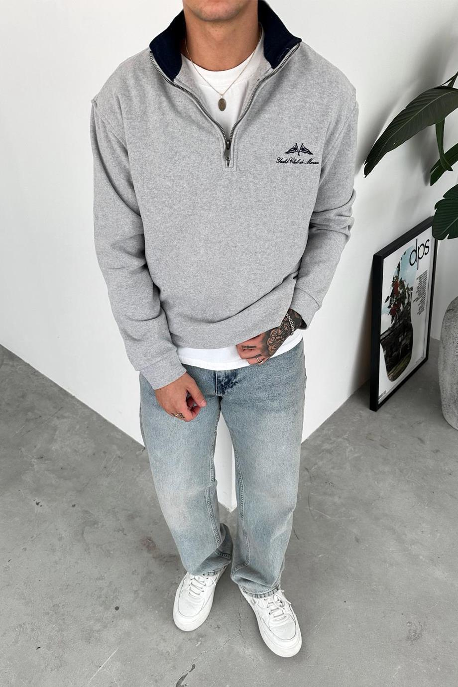 Gri Yacht Club Yarım Fermuar Relaxed Sweatshirt (HF0030-PM-K)