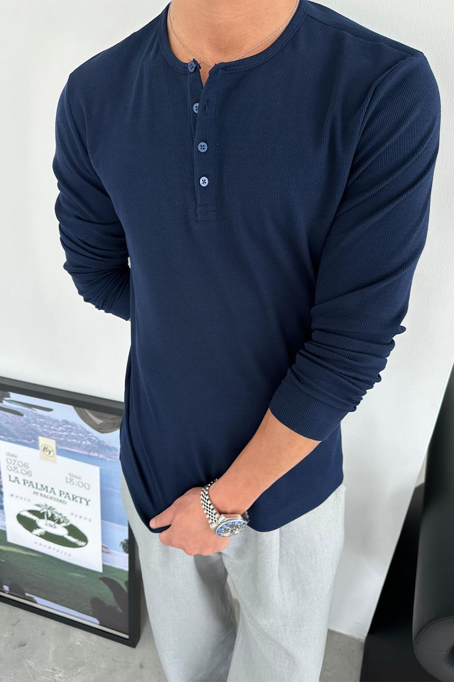İndigo Basic Fitilli Düğmeli Yaka Relax Fit Uzun Kollu Tişört (HF003-MH-Y)