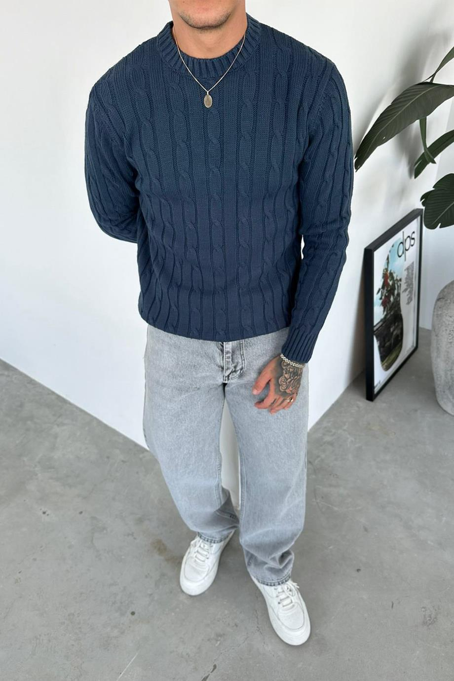 İndigo Örgü Desen Relaxed Triko Kazak (HF0039-MH-K)