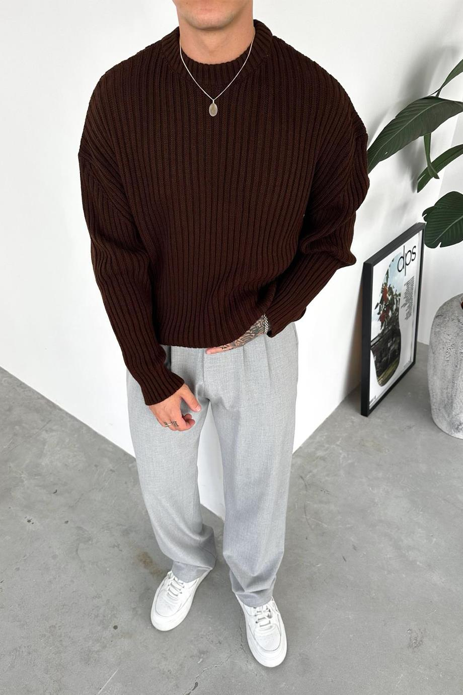 Kahverengi Bisiklet Yaka Fitilli Oversize Triko Kazak (HF0043-MH-K)