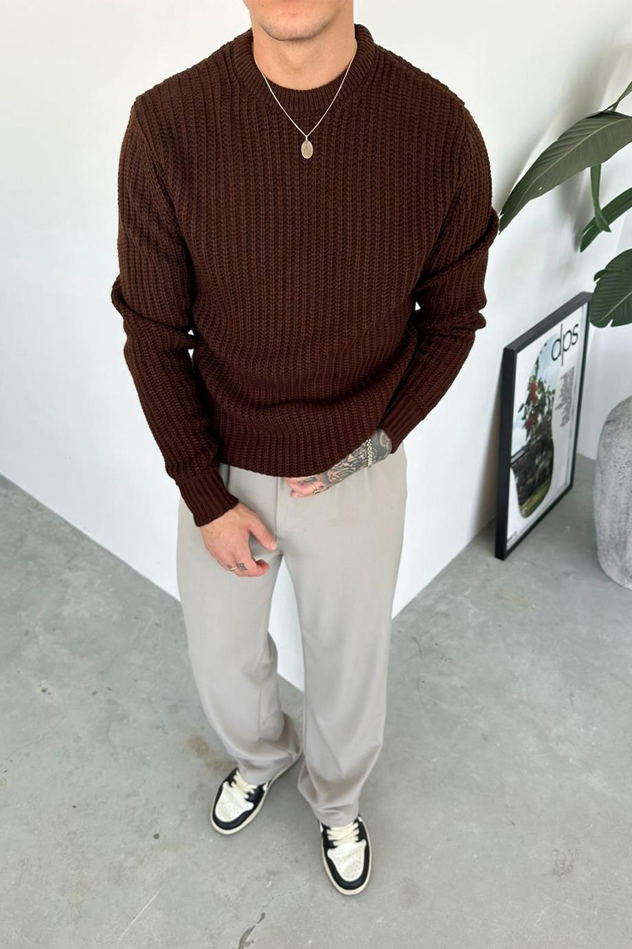 Kahverengi Bisiklet Yaka Oversize Örgü Kazak (HF0037-MH-K)