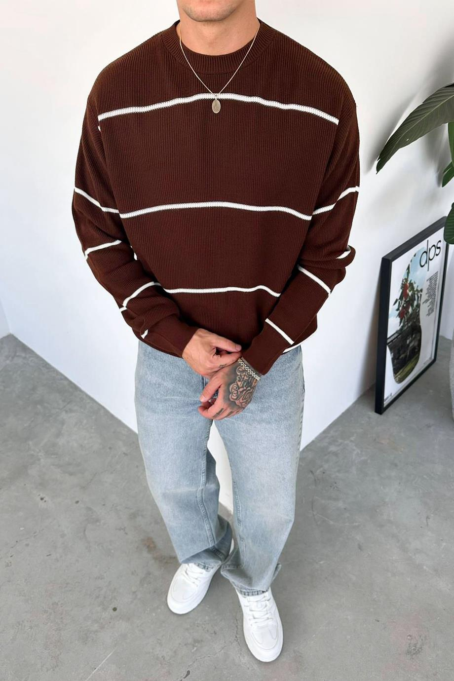 Kahverengi Çizgili Relaxed Triko Kazak (HF0010-PM-K)