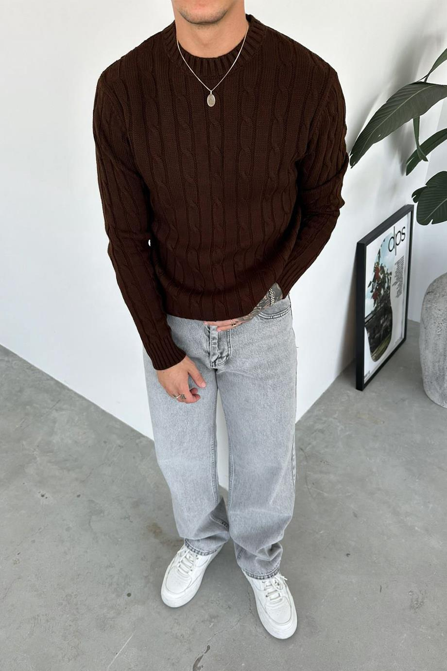 Kahverengi Örgü Desen Relaxed Triko Kazak (HF0039-MH-K)