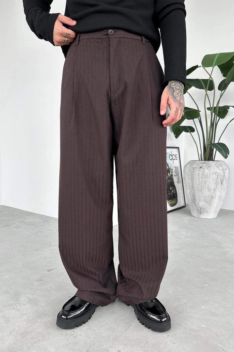 Kahverengi Parfe Çizgili Beli Lastikli Premium Kumaş Pantolon (HF0082-GO-K)