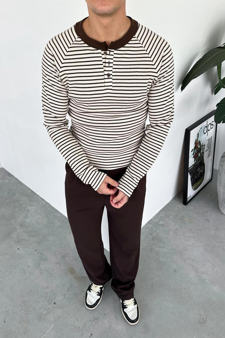 Kahverengi Premium Çizgili Düğmeli Yaka Uzun Kollu Tişört