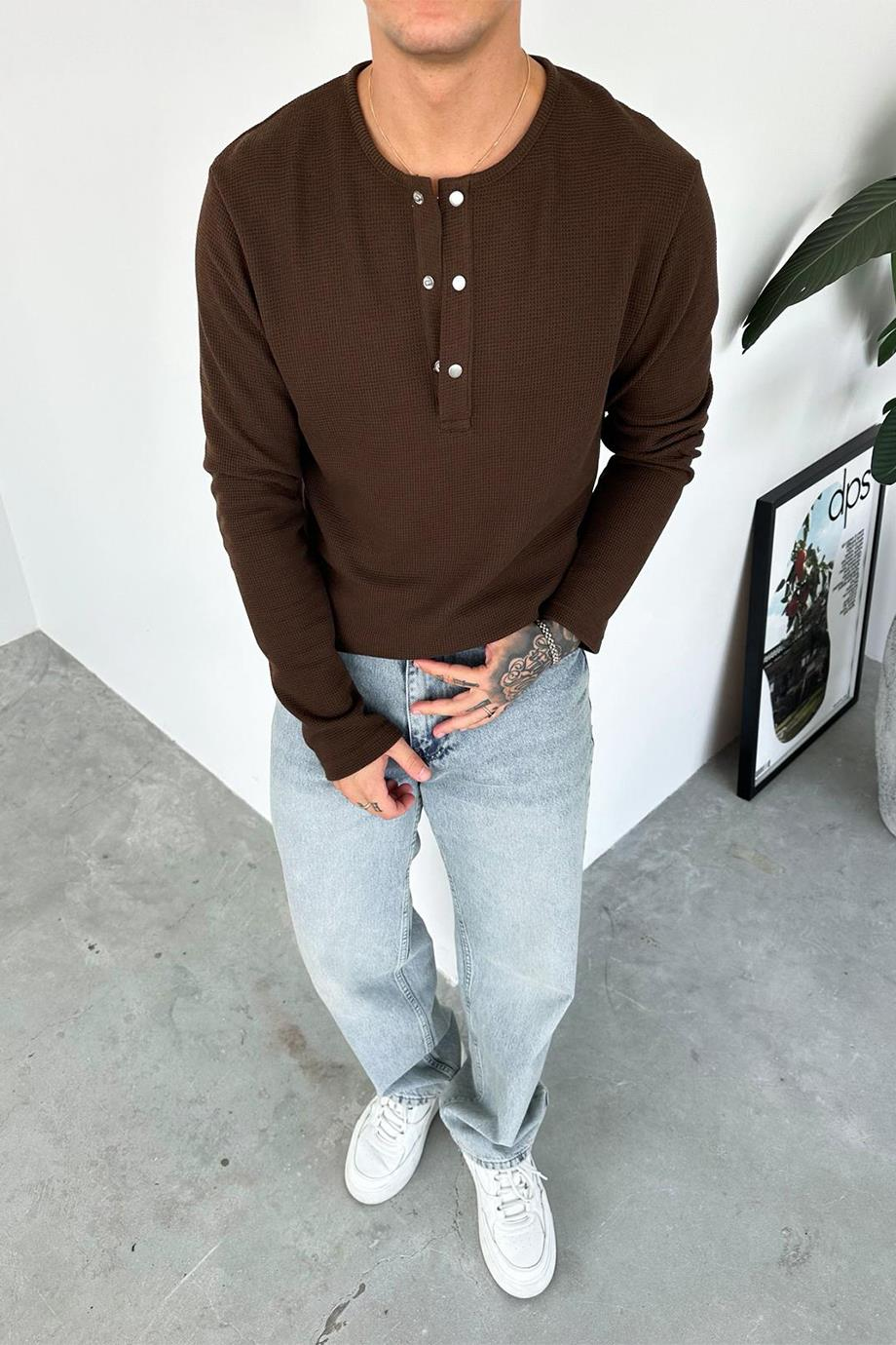 Kahverengi Premium Örme Waffle Düğmeli Yaka Uzun Kollu Tişört