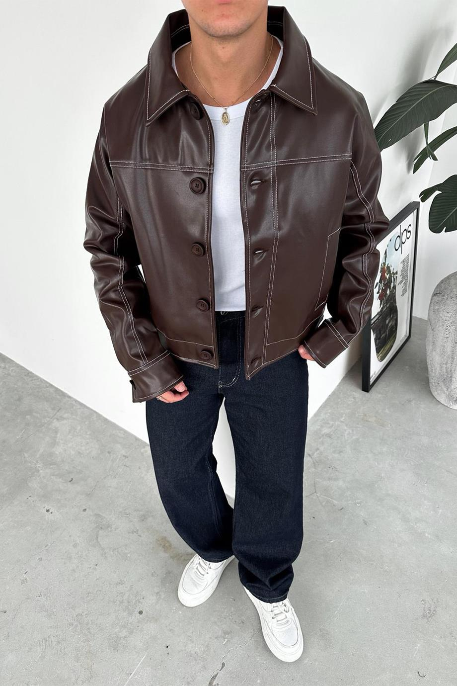 Kahverengi Ters Dikiş Crop Kesim Premium Deri Ceket