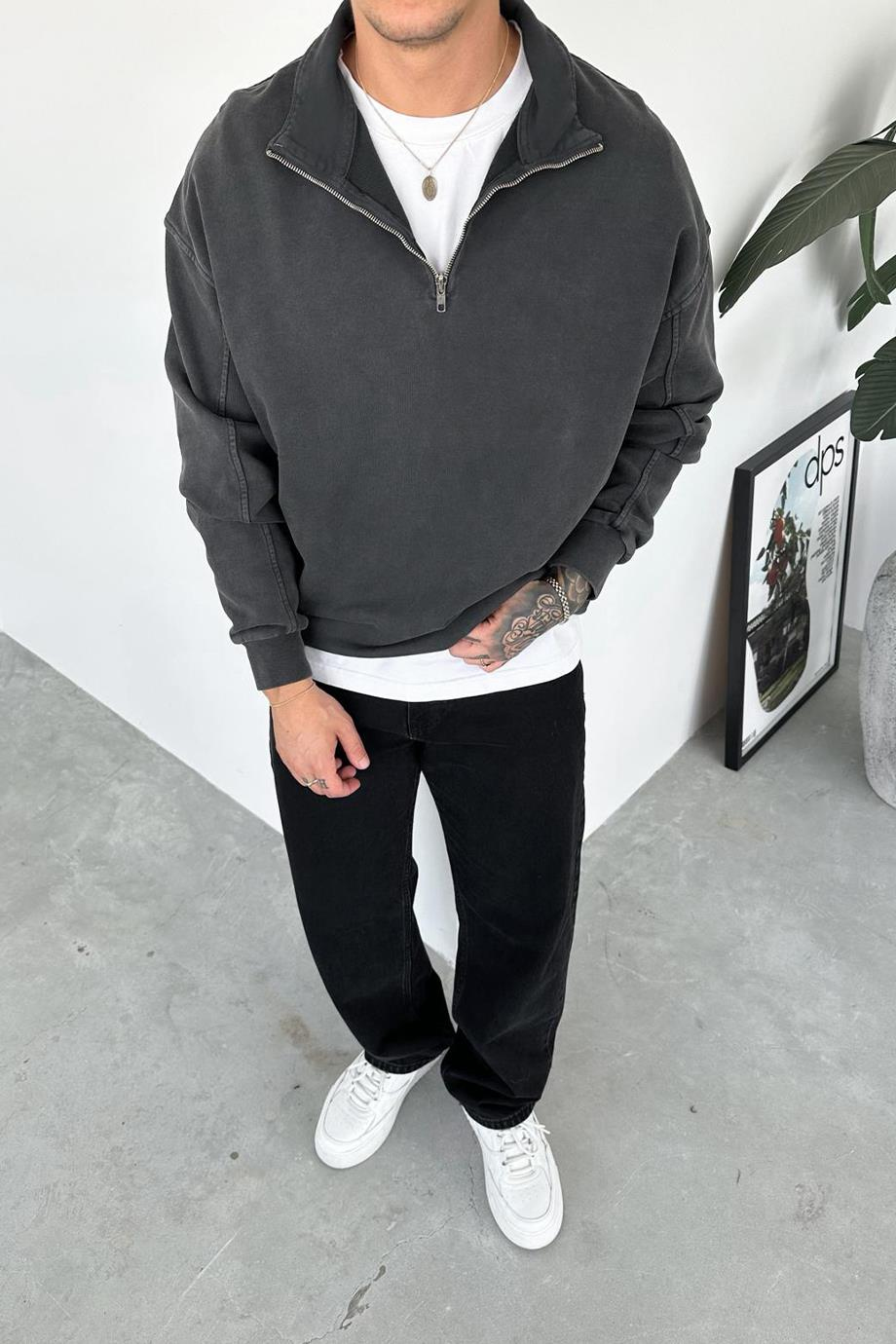 Koyu Gri Acid Wash Yarım Fermuar Oversize Sweatshirt (HF0031-DL-K)