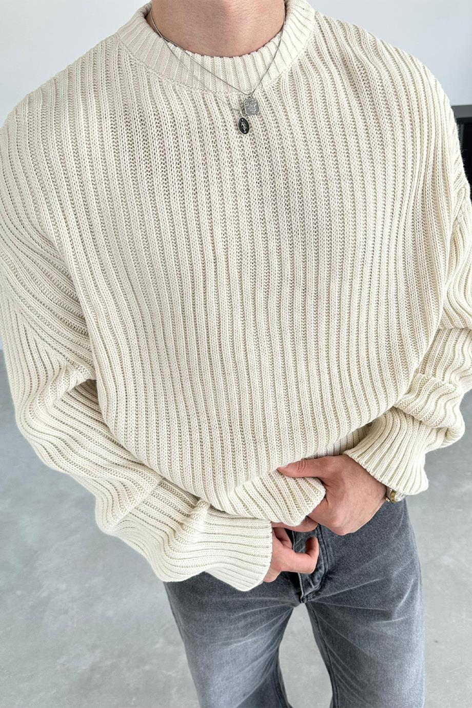 Krem Bisiklet Yaka Fitilli Oversize Triko Kazak (HF0018-MH-K)