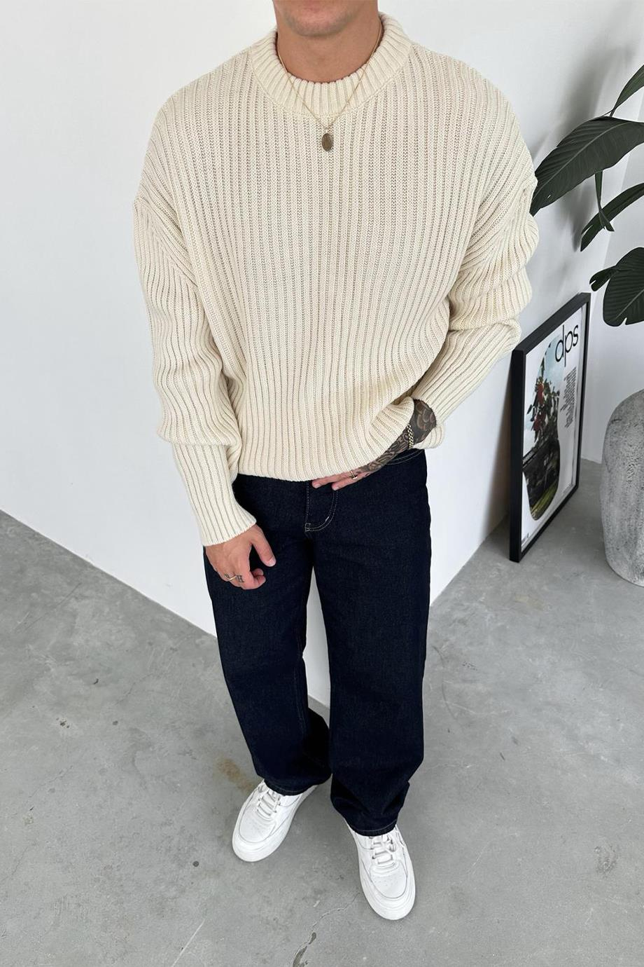 Krem Bisiklet Yaka Fitilli Oversize Triko Kazak (HF0043-MH-K)