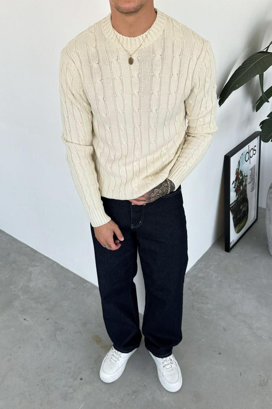 Krem Örgü Desen Relaxed Triko Kazak (HF0039-MH-K)
