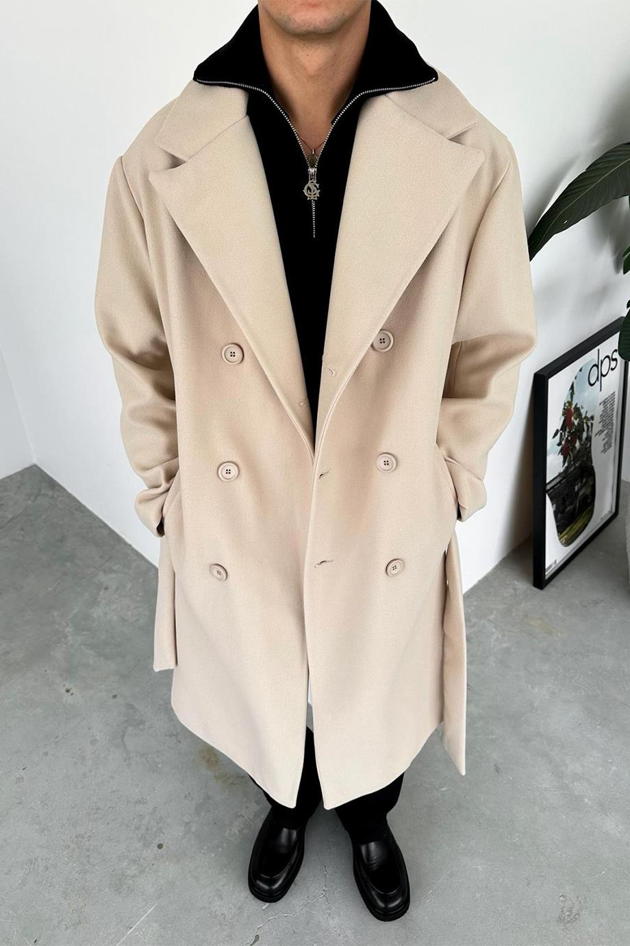 Krem Premium Basic Kemerli Kaşe Kaban (HF0085-GO-K)