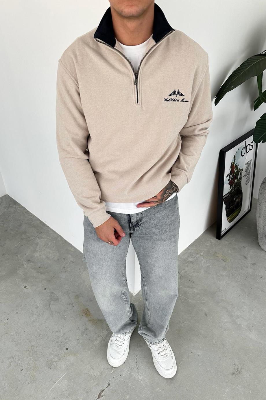 Krem Yacht Club Yarım Fermuar Relaxed Sweatshirt