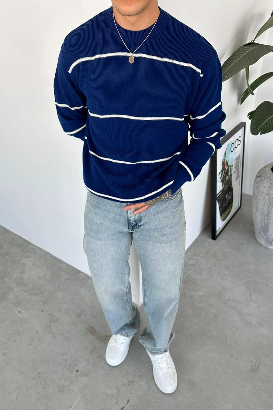 Lacivert Çizgili Relaxed Triko Kazak (HF0010-PM-K)