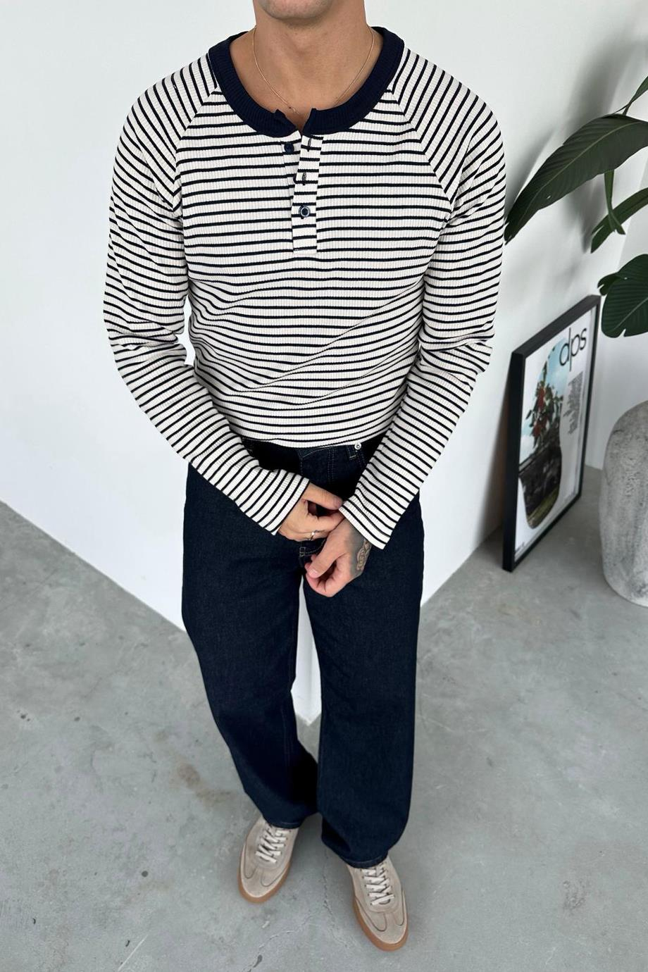 Lacivert Premium Çizgili Düğmeli Yaka Uzun Kollu Tişört (HF0079-GO-K)