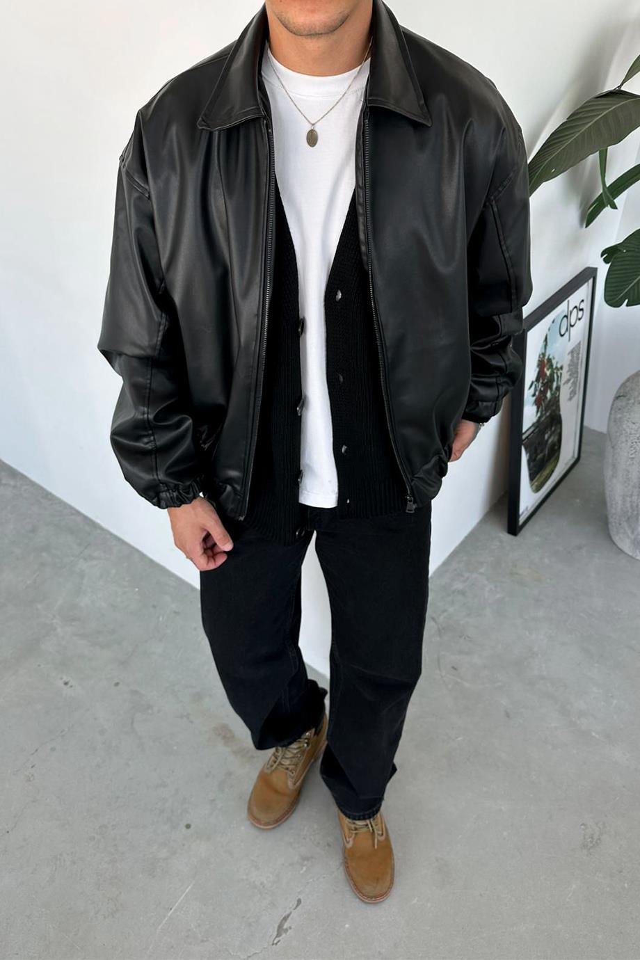 Siyah Beli Lastikli Oversize Deri Ceket (HF002-PM-K)