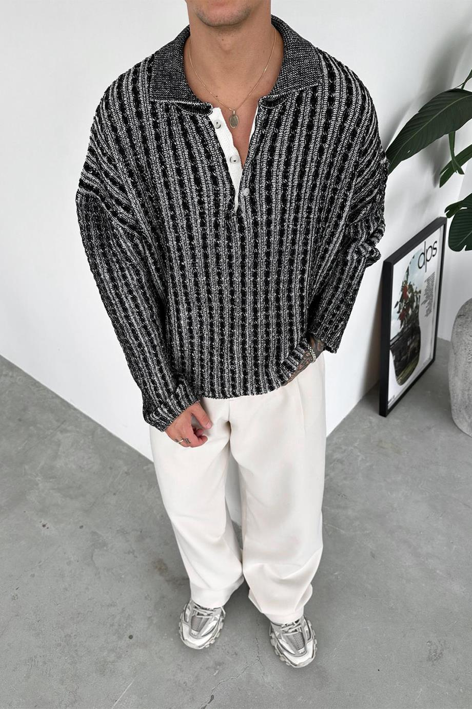 Siyah Örgü Desenli Premium Oversize Polo Yaka Kazak