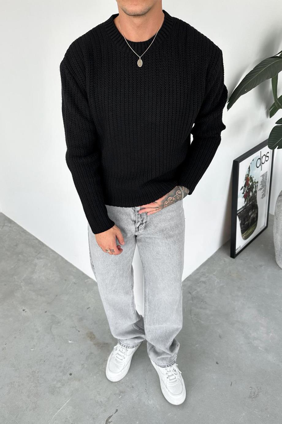 Siyah Örme Desen Relaxed Triko Kazak (HF0045-MH-K)