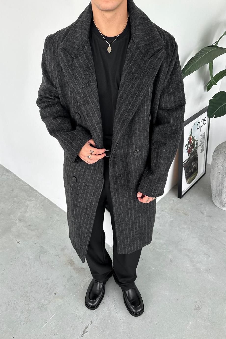 Gri Premium Basic Çizgili Kaşe Kaban Siyah Premium Basic Çizgili Kaşe Kaban