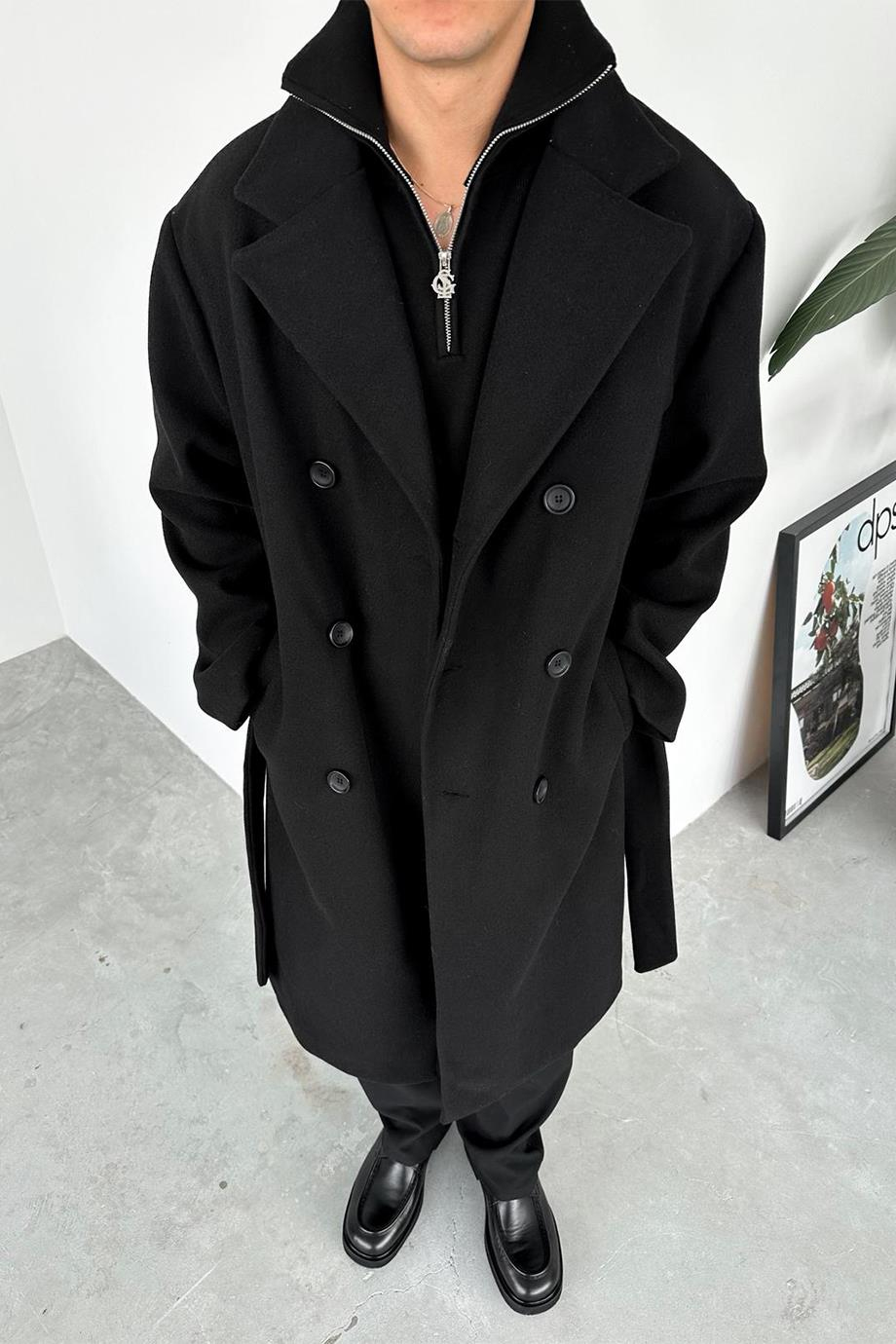 Siyah Premium Basic Kemerli Kaşe Kaban (HF0085-GO-K)