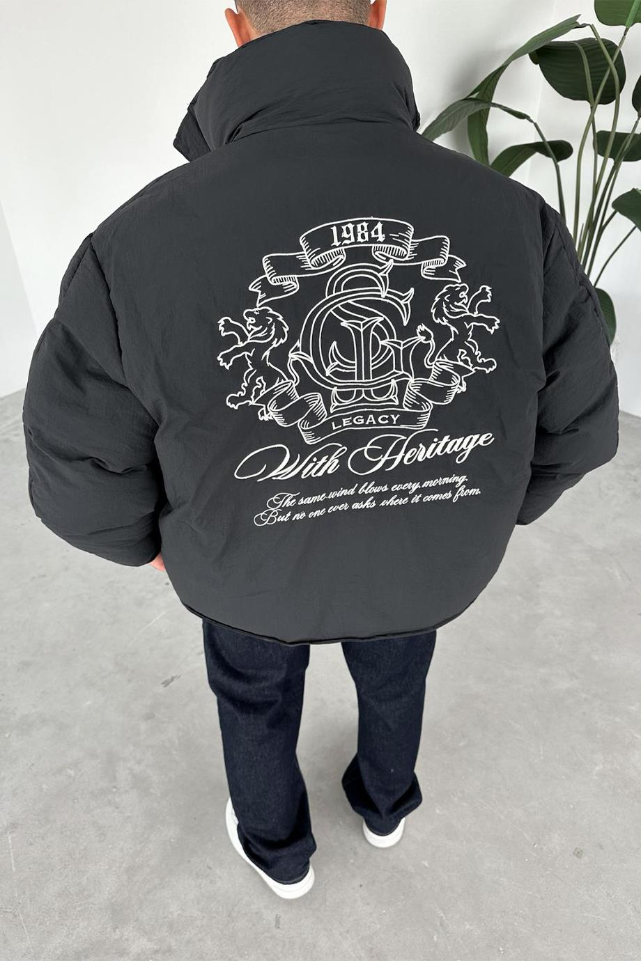 Siyah Premium Nakış İşlemeli Puffer Mont