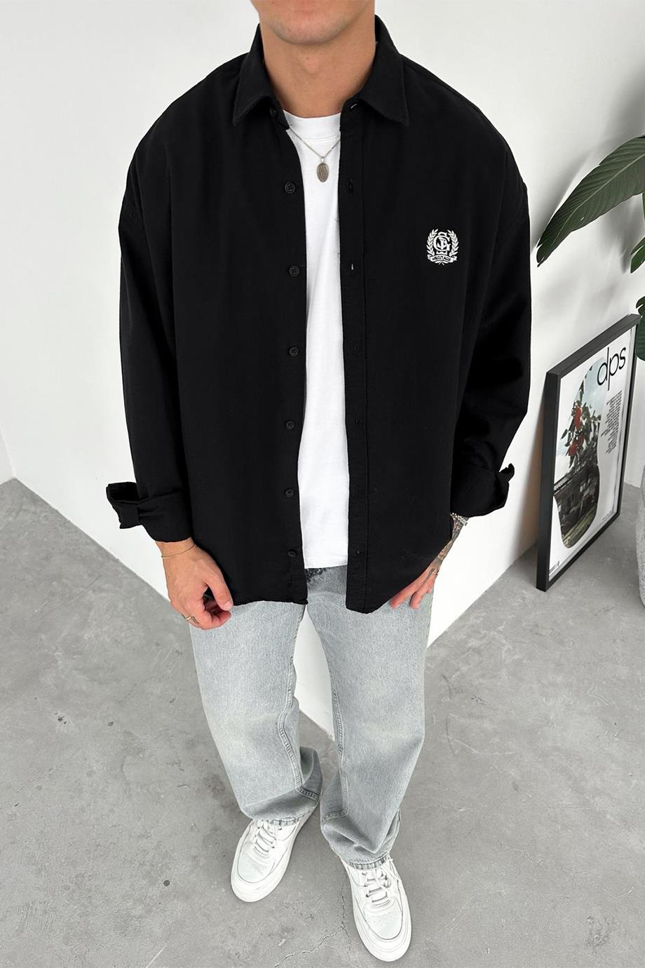 Siyah Premium Nakış İşlemeli Relaxed Gömlek (HF0066-GO-K)