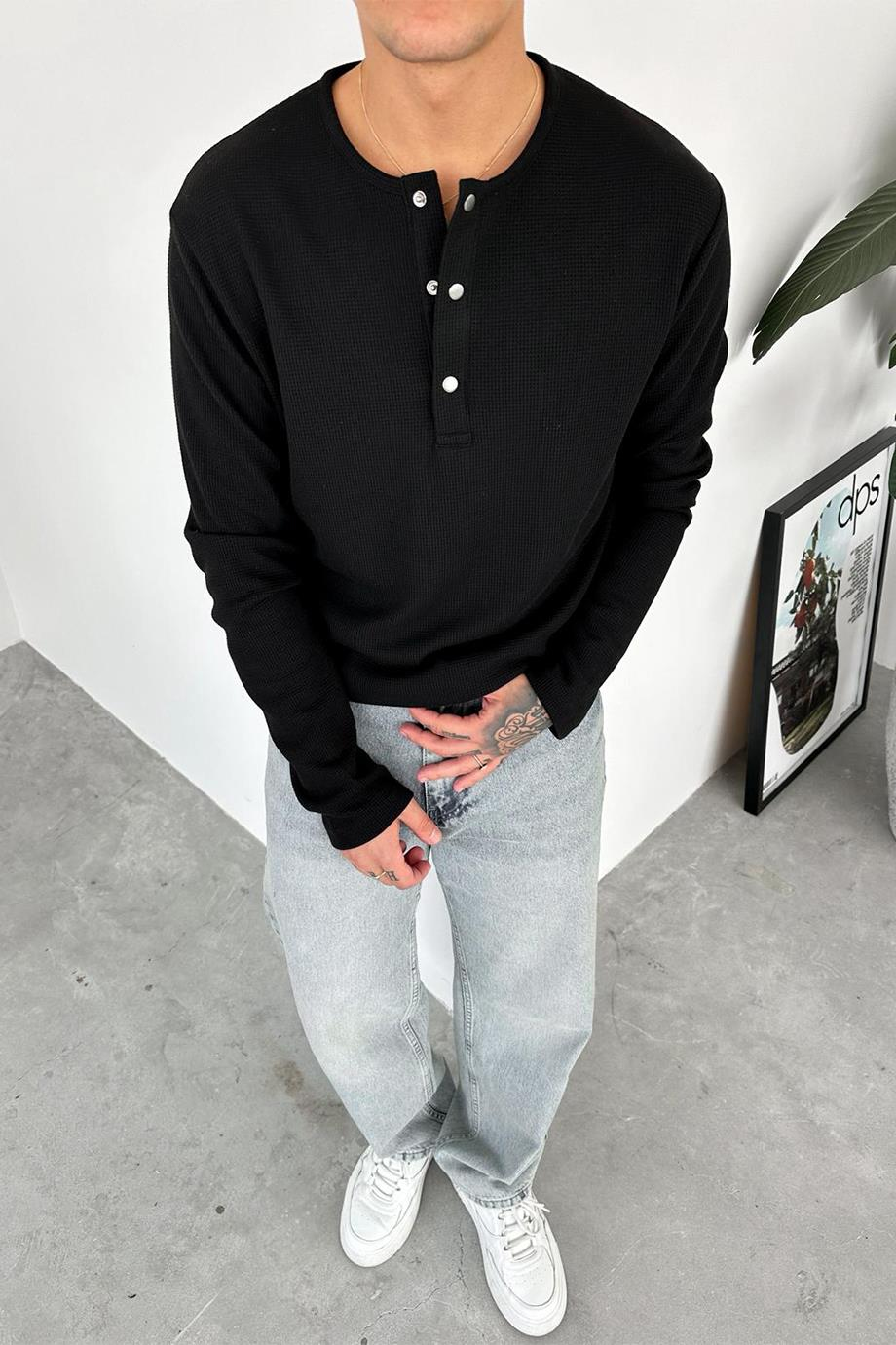 Siyah Premium Örme Waffle Düğmeli Yaka Uzun Kollu Tişört