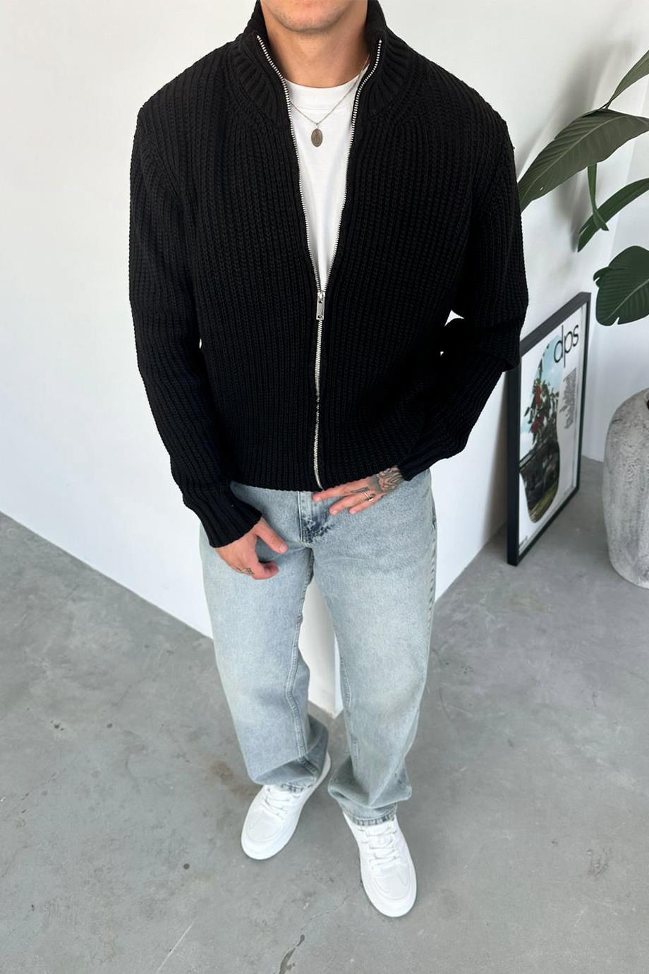 Siyah Tam Fermuarlı Relaxed Örgü Kazak (HF0050-MH-K)
