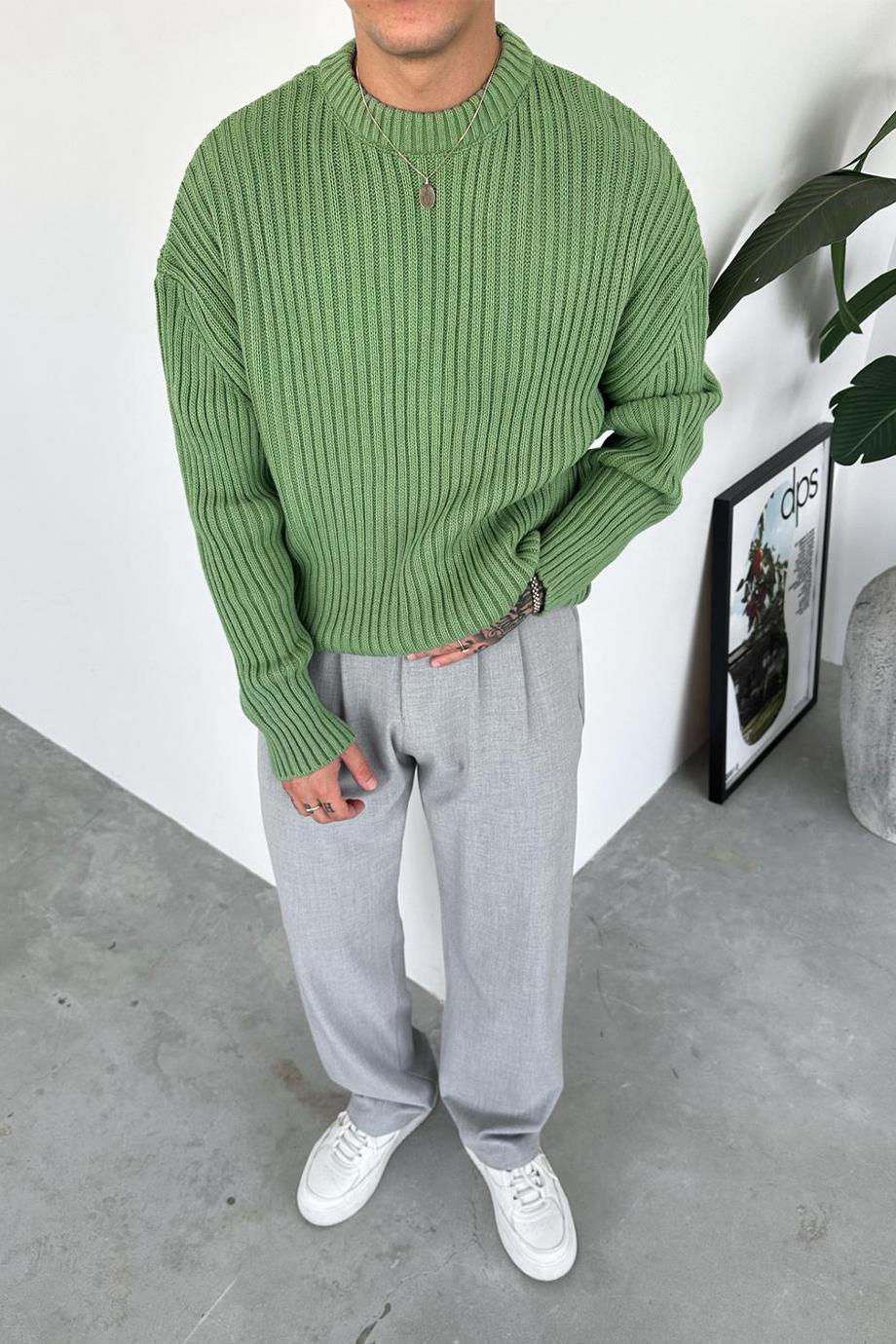 Yeşil Bisiklet Yaka Fitilli Oversize Triko Kazak (HF0043-MH-K)